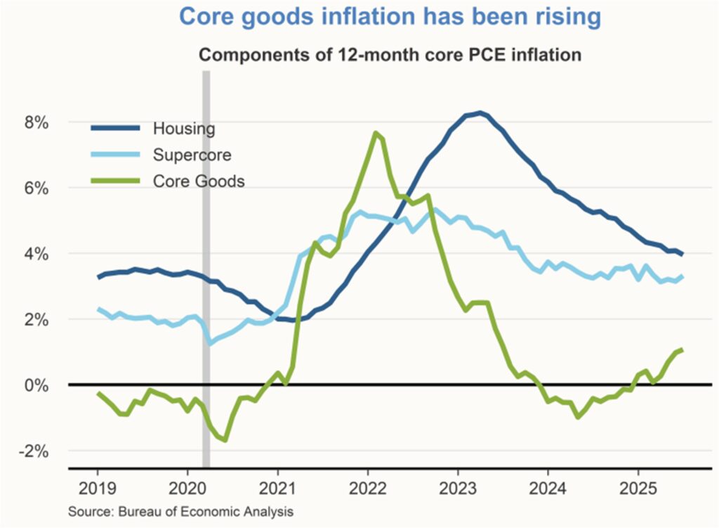 Inflation remains somewhat elevated, and the disinflationary trend that was evident a year ago may have stalled. Inflation measured by the 12-month change in the personal consumption expenditures (PCE) price index was 2.6% in July, The 12-month core PCE inflation rate, which omits volatile food and energy categories, was 2.9% in July. Both inflation measures have seen little change over the last 12 to 18 months, suggesting that progress towards the Federal Open Market Committee (FOMC)’s 2% longer-run goal may have stalled. PCE inflation is expected to rise in coming months as tariff-driven price increases of imported goods filter through the economy.