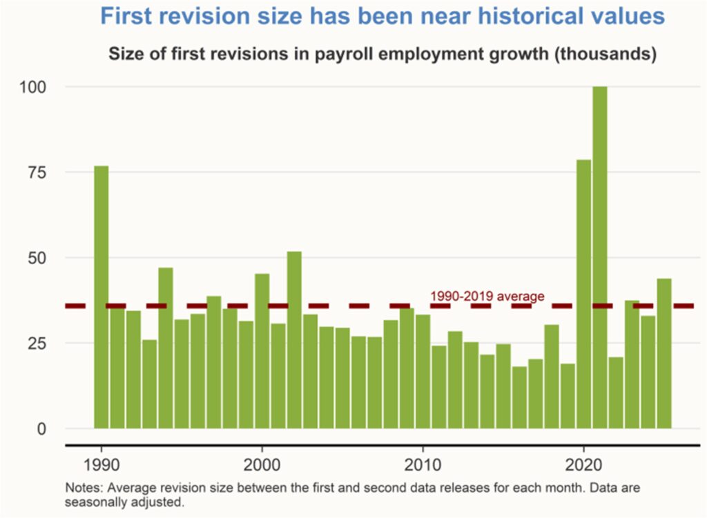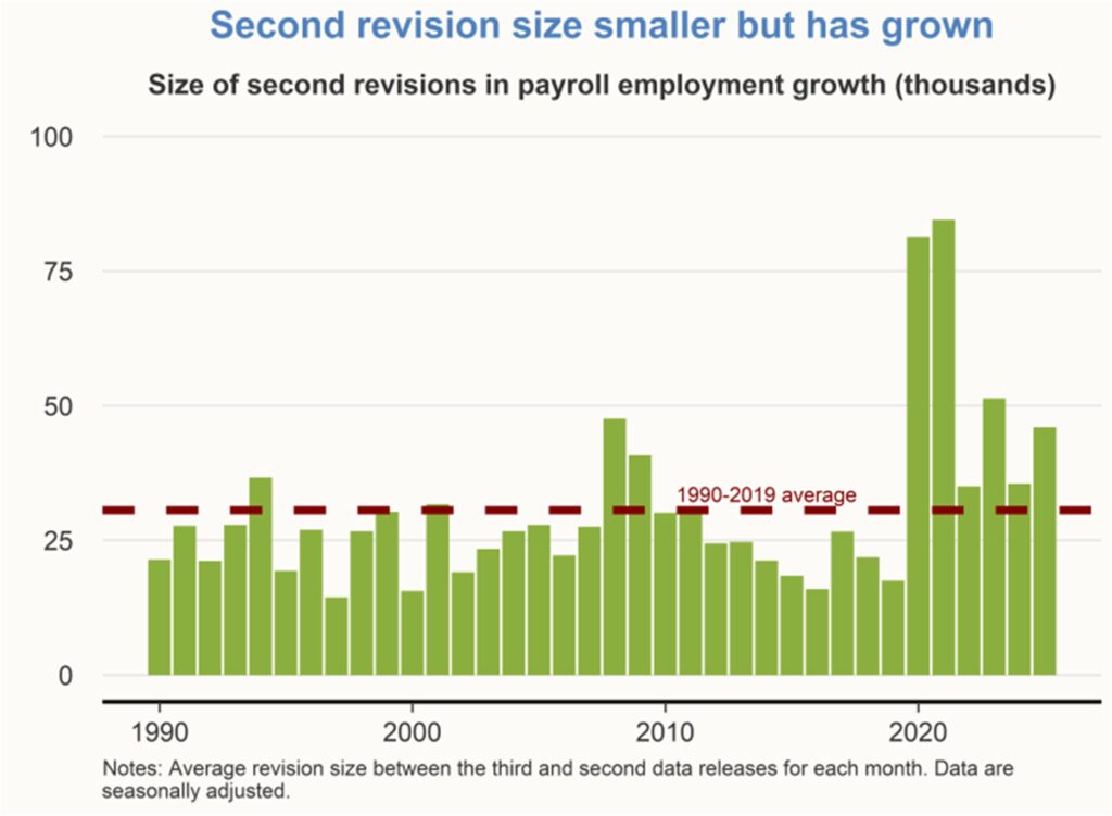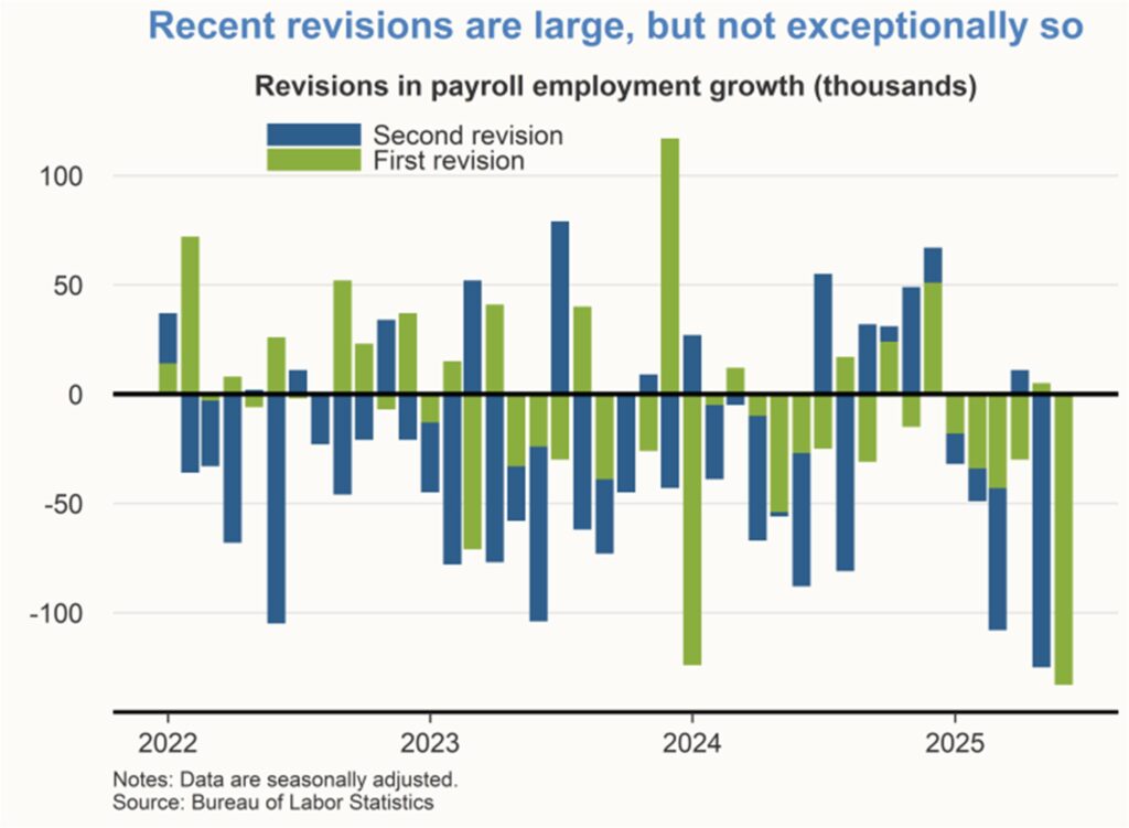 The July 2025 employment report from the Bureau of Labor Statistics (BLS) included a substantial downward revision to the job growth estimates for the previous two months. Revisions to prior estimates are a routine element of every single employment report. For a typical month’s job growth estimate, the initial release is followed by two rounds of revisions released in the two months following the initial release.