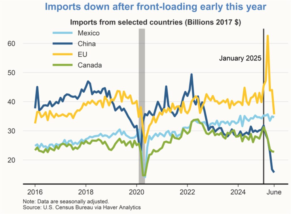 U.S. imports from China and Canada peaked in January and fell precipitously in subsequent months. Imports from the EU saw a substantial run-up in March that was quickly reversed to a lower level. By contrast, imports from Mexico have been relatively stable.