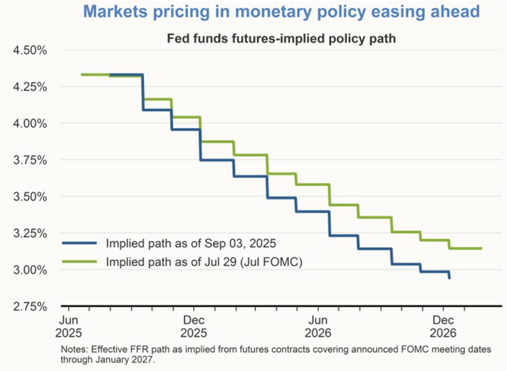 The FOMC’s target range for the federal funds rate has been unchanged at 4¼ to 4½% for almost a year. Financial market participants are currently projecting an easing in monetary policy in the coming months. At the July 2025 FOMC meeting, the implied path for the funds rate from financial markets was 50 basis points lower than the current funds rate by the end of 2025. This level was consistent with the median of the FOMC’s Summary of Economic Projections (SEP) in June 2025. But since the July meeting, financial market participants are now projecting a funds rate path that is even lower by the end of 2025.