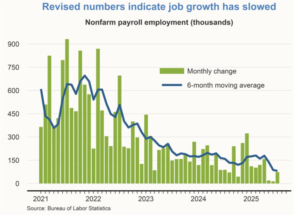 While economic activity in the United States has remained resilient, recent data show some softening in the labor market. Swings in net exports affected GDP in the first half of 2025, with imports surging in the first quarter followed by imports declining in the second quarter. Inflation remains above the Fed’s 2% goal, and a near-term rise from tariffs appears likely. Job gains in recent months have slowed. Downward revisions for recent job growth estimates have been large, but the magnitudes of these revisions are not out of line with historical values. Job growth estimates remain reliable despite data collection challenges. With the balance of risks surrounding the Fed’s dual mandate now shifting, market participants are projecting an easing of monetary policy in coming months.