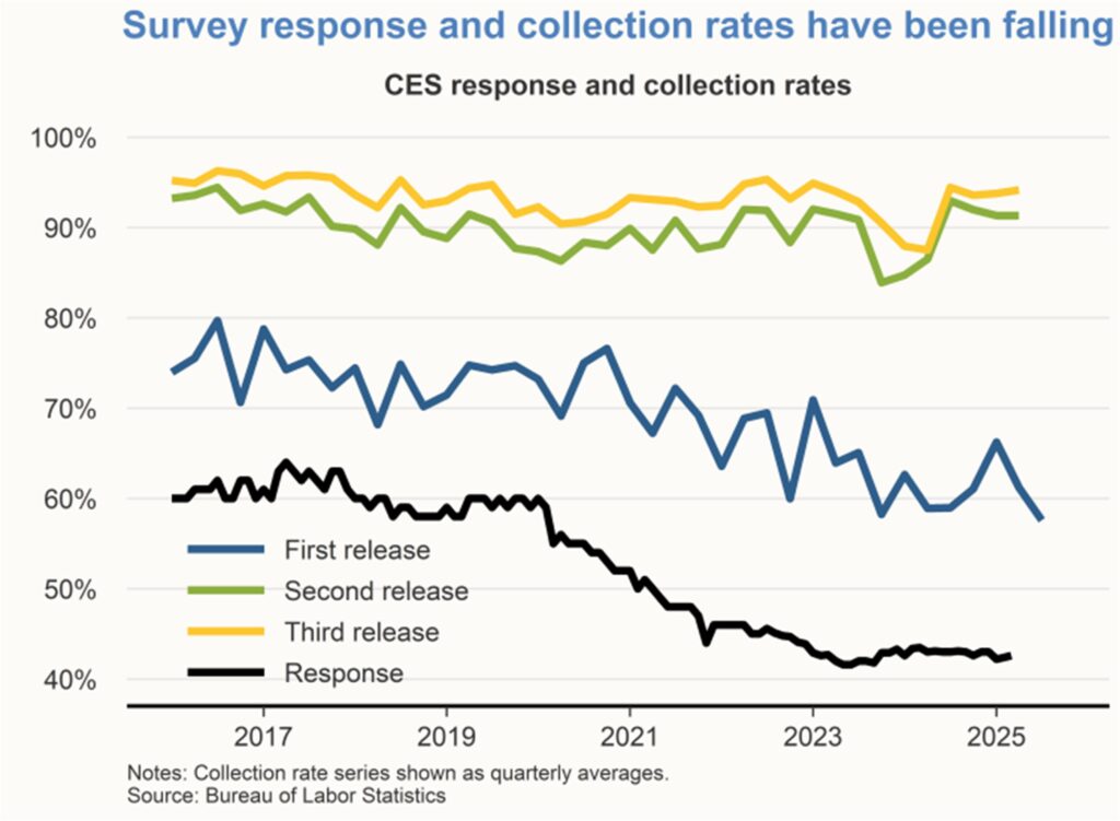 In recent years, and especially since the pandemic, the BLS has faced declining response and collection rates to the establishment survey that is used to estimate job gains. The BLS surveys about 121,000 establishments consisting of businesses and government agencies covering roughly one-fourth of total payroll employment in the U.S. economy. The survey response rate is the fraction of establishments responding to the BLS’s request to participate in the survey. Starting around 2020, the survey response rate declined from around 60% to its current level of about 43%. At the same time, the survey responses are coming in later. The survey collection rate is the fraction of participating establishments that send in their data during a given month. The collection rate for the initial release of the monthly employment report is around 60%, while the collection rates for the second and third releases of the report that feed into subsequent revisions have remained relatively steady at or above 90%. In other words, the initial employment report for a given month is based on a smaller number of submitted responses from establishments. This pattern implies more scope for subsequent revisions as delayed responses from establishments come in and are incorporated into the second and third estimates of job growth for a given month.