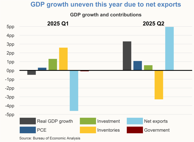 Economic growth fluctuated in the first half of the year, with real GDP contracting slightly in the first quarter followed by solid growth in the second quarter. These movements were affected by outsized swings in net exports, which is the difference between exports and imports. These swings are attributable to the anticipation of tariff increases, and tariff increases going into effect. In the first quarter, net exports reduced real GDP growth during a large inventory buildup. Net exports increased real GDP growth in the second quarter, but inventories declined, delivering a negative contribution to growth.