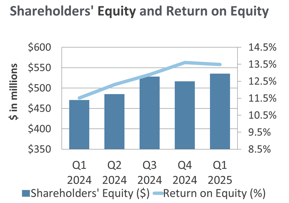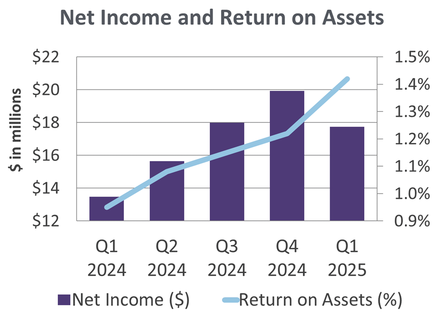 Total assets as of March 31 totaled $4.9 billion, $322.9 million lower than prior year without Bank Term Funding Program borrowings. Return on assets for the first quarter of 2025 increased to 1.42% compared to 95 basis points for the first quarter of 2024 on strong net income performance.